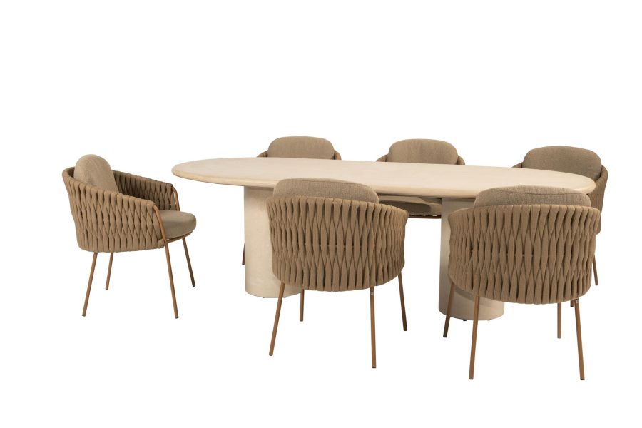 De bijpassende Hampton tuintafel heeft twee dikke ronde poten van mortex en een groot ovaal mortex tafelblad van 240 x 105 cm. De tafel is 75 cm hoog.
