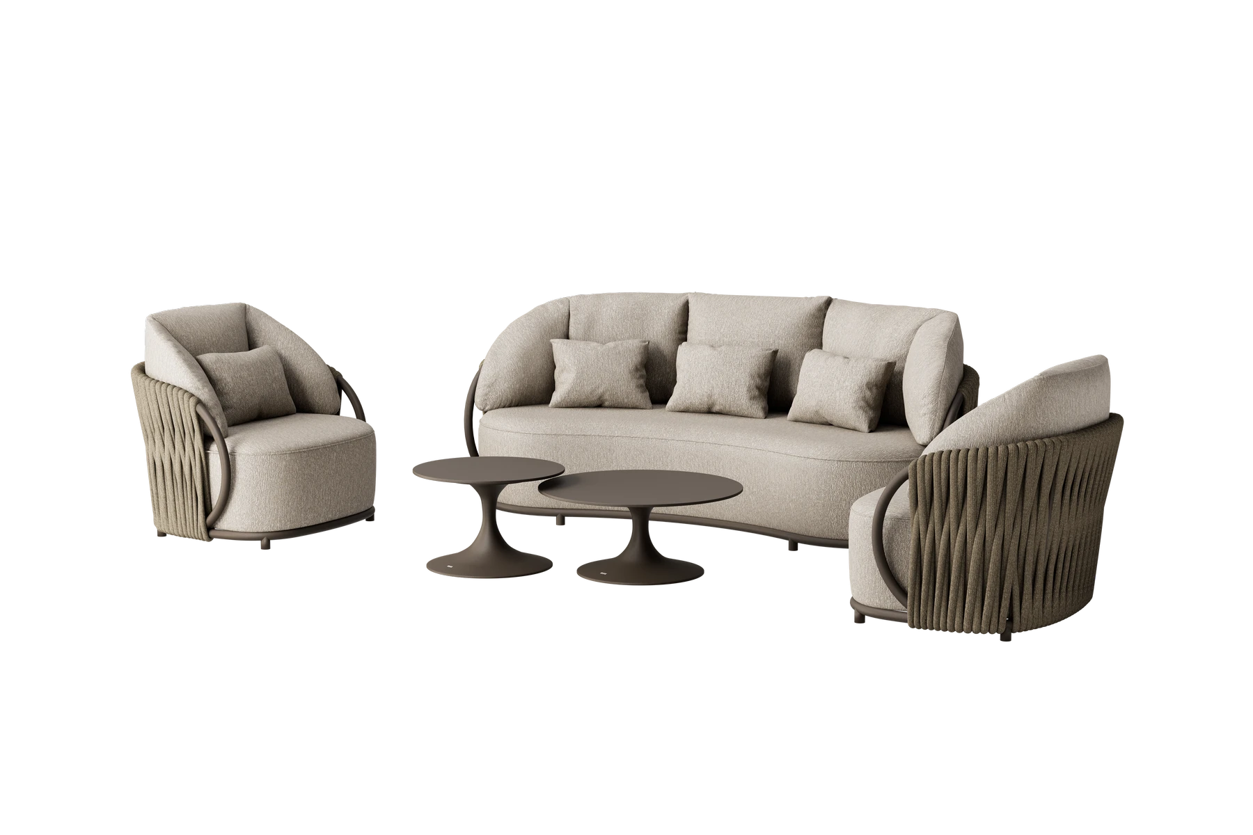 De set wordt geleverd inclusief 2 bijpassende Nova loungetafels. De tafels hebben een fraai design in dezelfde bronzen kleur als de Vivaro meubels. De ronde sintered stone tafelbladen hebben diameters van 80 cm en 60 cm.