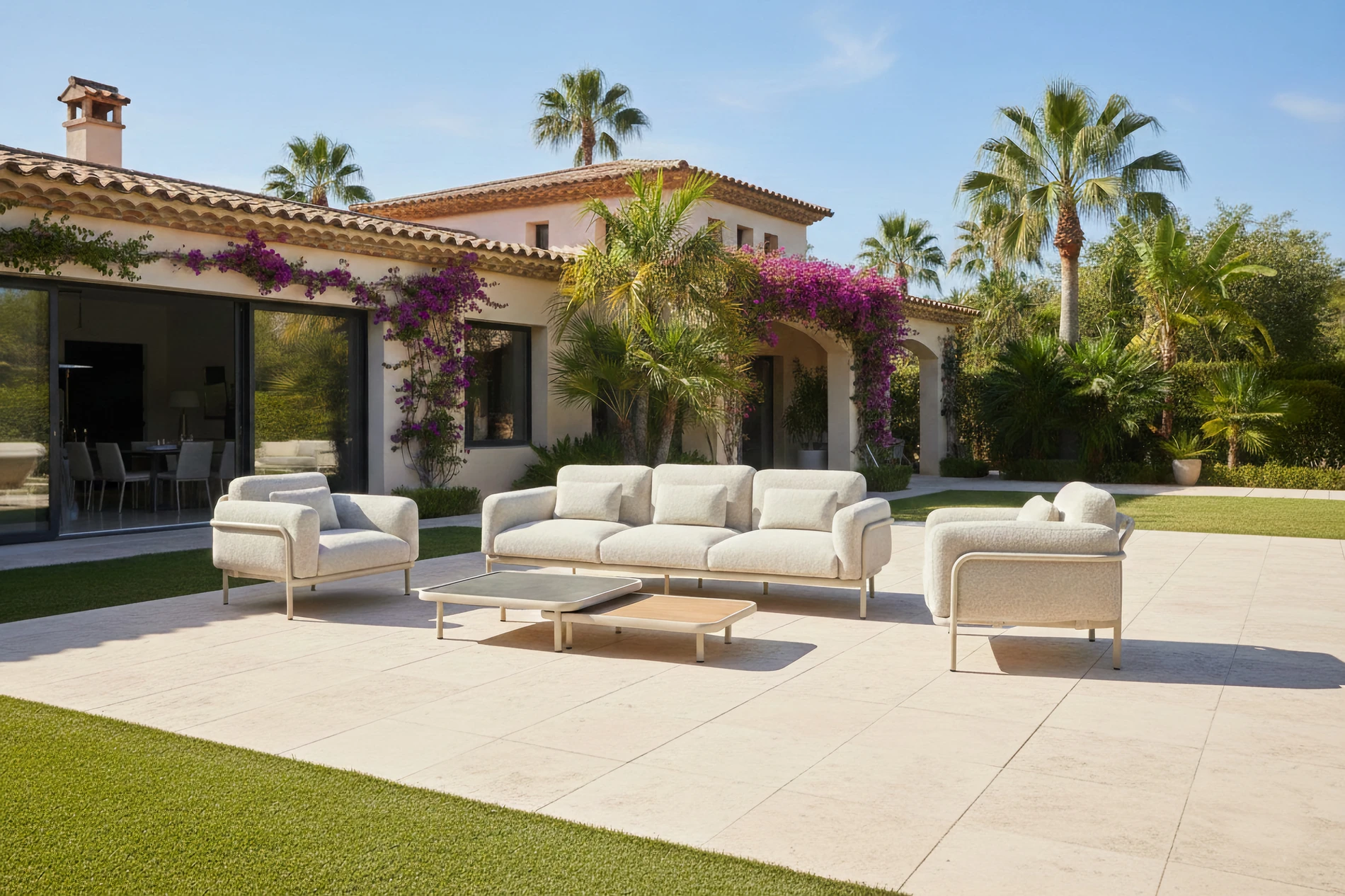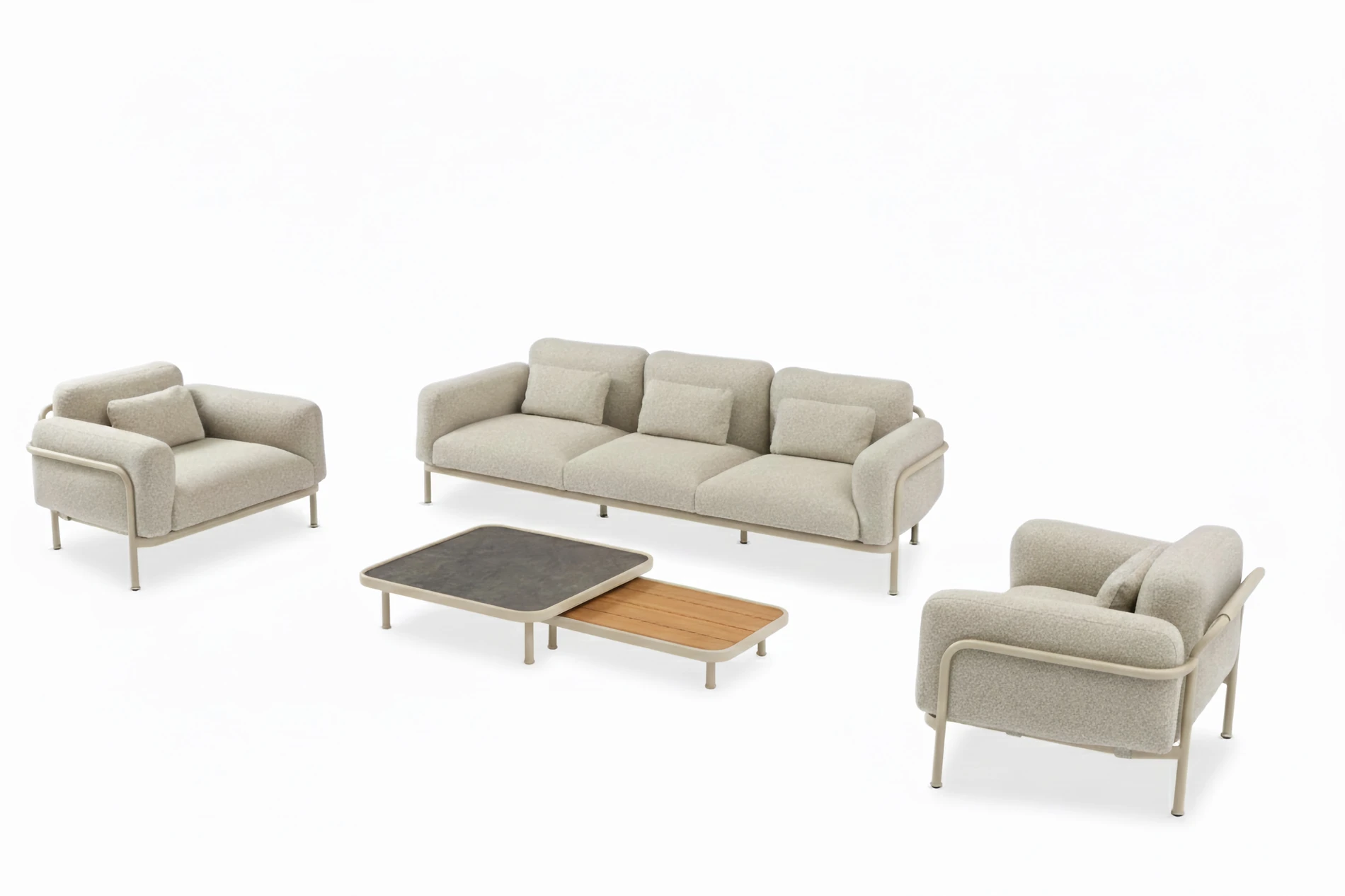 De set is voorzien van royale kussens, die zijn bekleed met een zachte en weerbestendige Sable Bouclé kussenstof. Deze stof voelt aangenaam aan en zorgt voor een uitstekend zitcomfort. Naast zit- en rugkussens beschikt de set ook over extra dikke lendenkussens, die optimale ondersteuning bieden. De kussens zijn waterafstotend en schimmelwerend, waardoor ze zonder zorgen buiten kunnen blijven liggen.