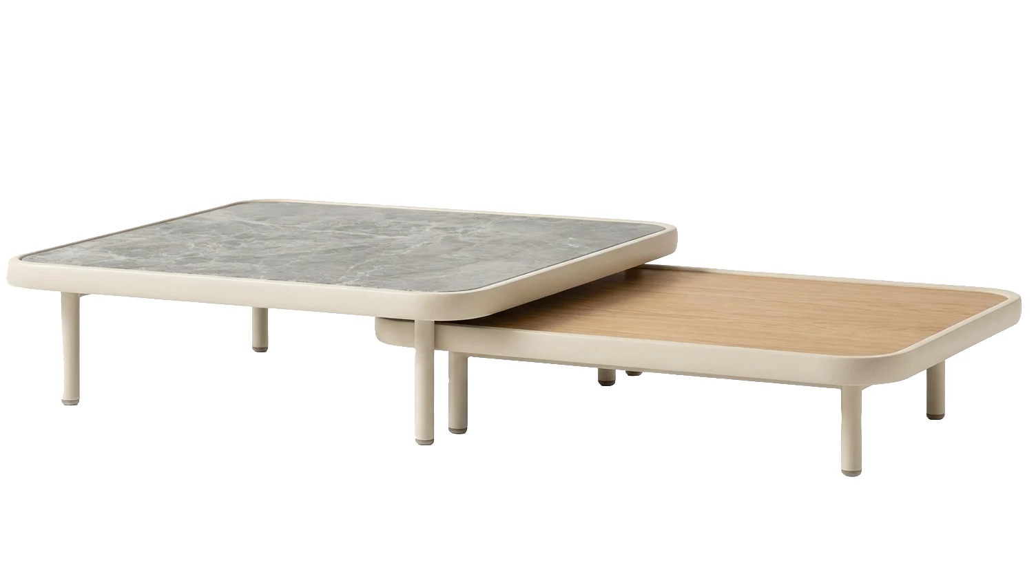 Optioneel kunt u de Santos loungeset uitbreiden met twee praktische loungetafels. Deze tafels hebben hetzelfde aluminium frame als de set en zijn voorzien van tafelbladen van teak en geprint keramiek. Het op gehard glas geprinte tafelblad heeft de uitstraling van keramiek en voelt aan als natuursteen.