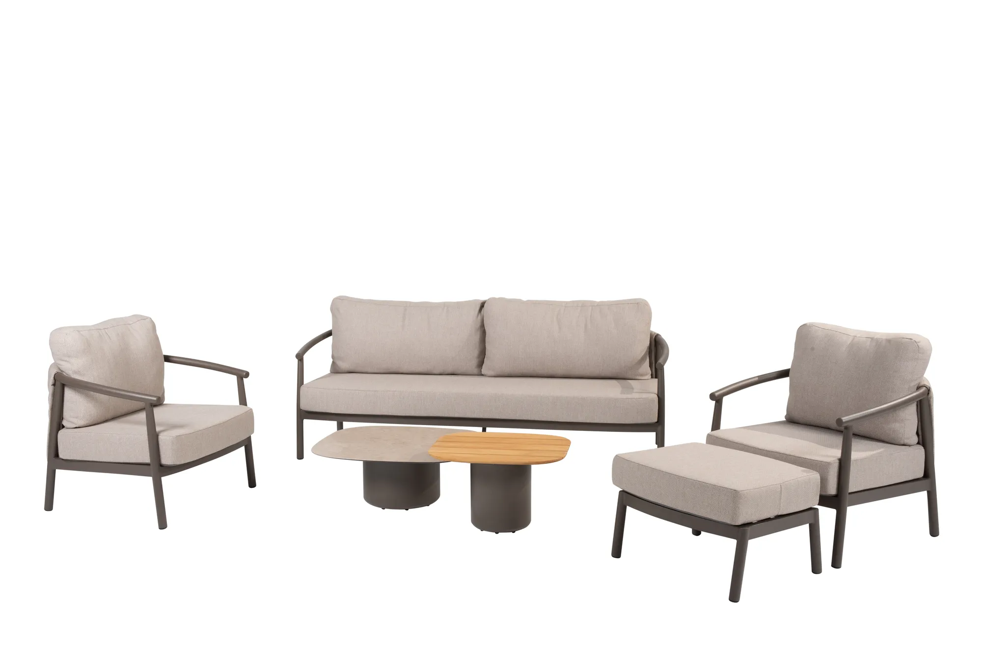 Optioneel kunt u een Barolo voetenbank terre en een set Demi tafels bijbestellen. De Barolo voetenbank heeft dezelfde eigenschappen en kwaliteiten als de loungeset. De Demi tafels van Taste by 4 Seasons hebben een aluminium onderstel met terre poedercoating en tafelbladen van geprint keramiek en teakhout.