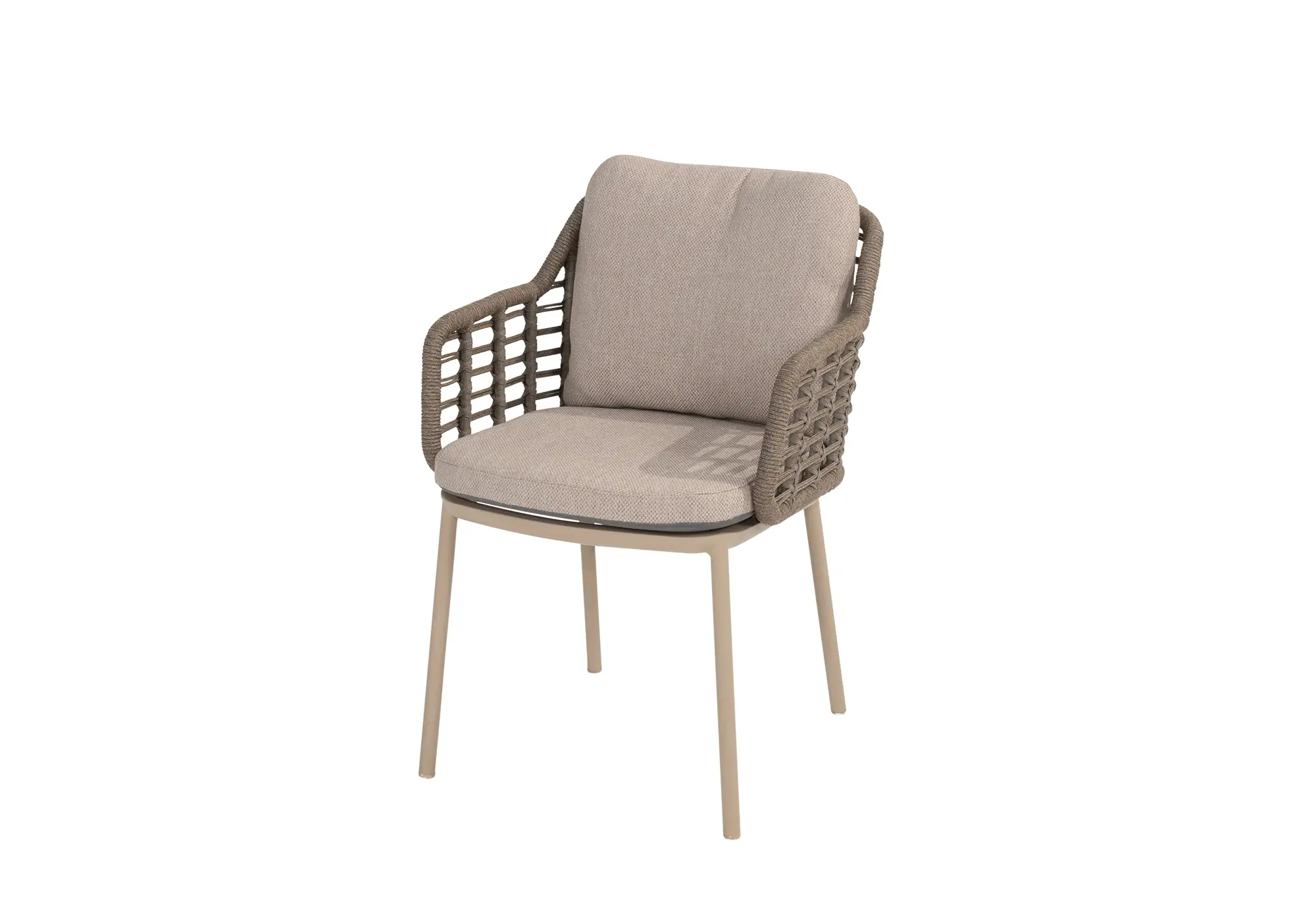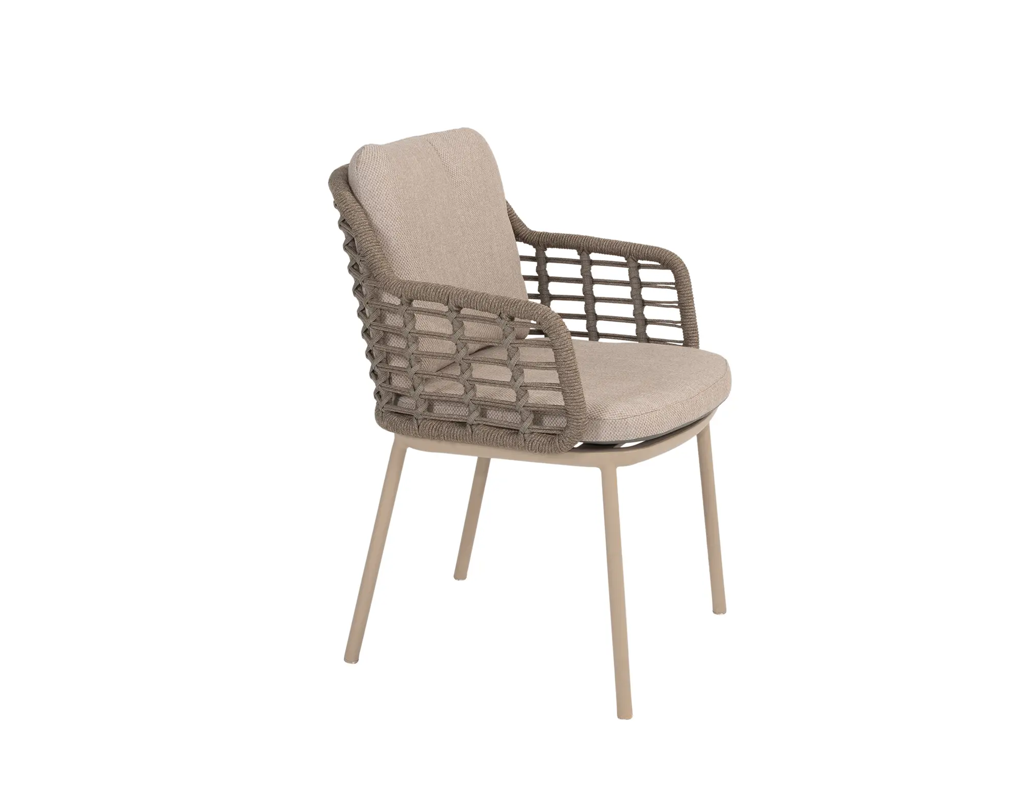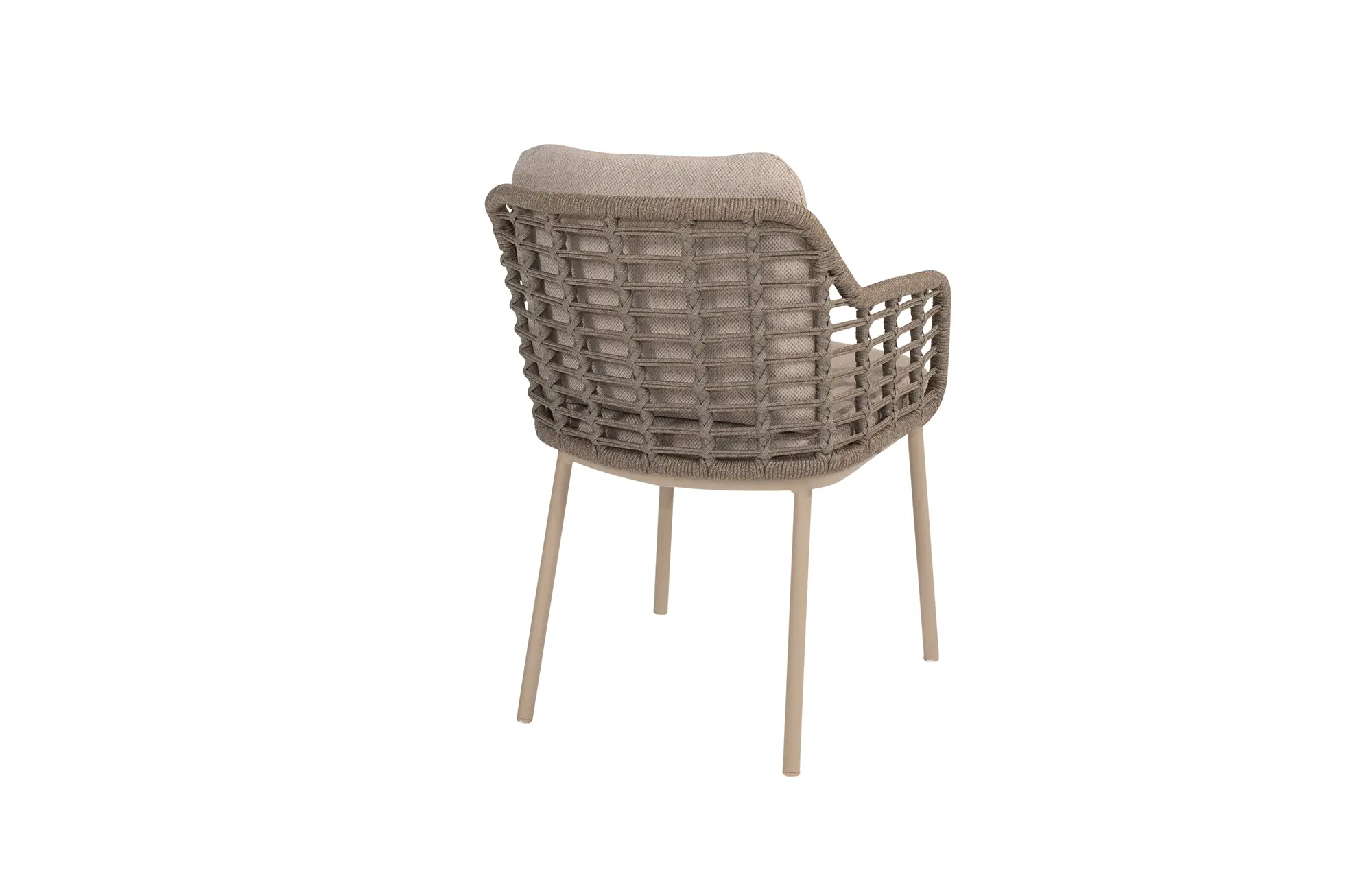 Het aluminium frame van de Puglia tuinstoelen is afgewerkt met een latte poedercoating, wat niet alleen zorgt voor een moderne uitstraling, maar ook extra bescherming biedt tegen weersinvloeden. De frames worden prachtig aangevuld met taupekleurig rope vlechtwerk, dat zowel stevig als elegant is.