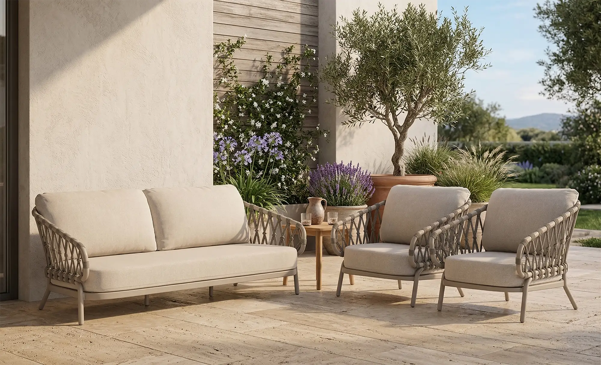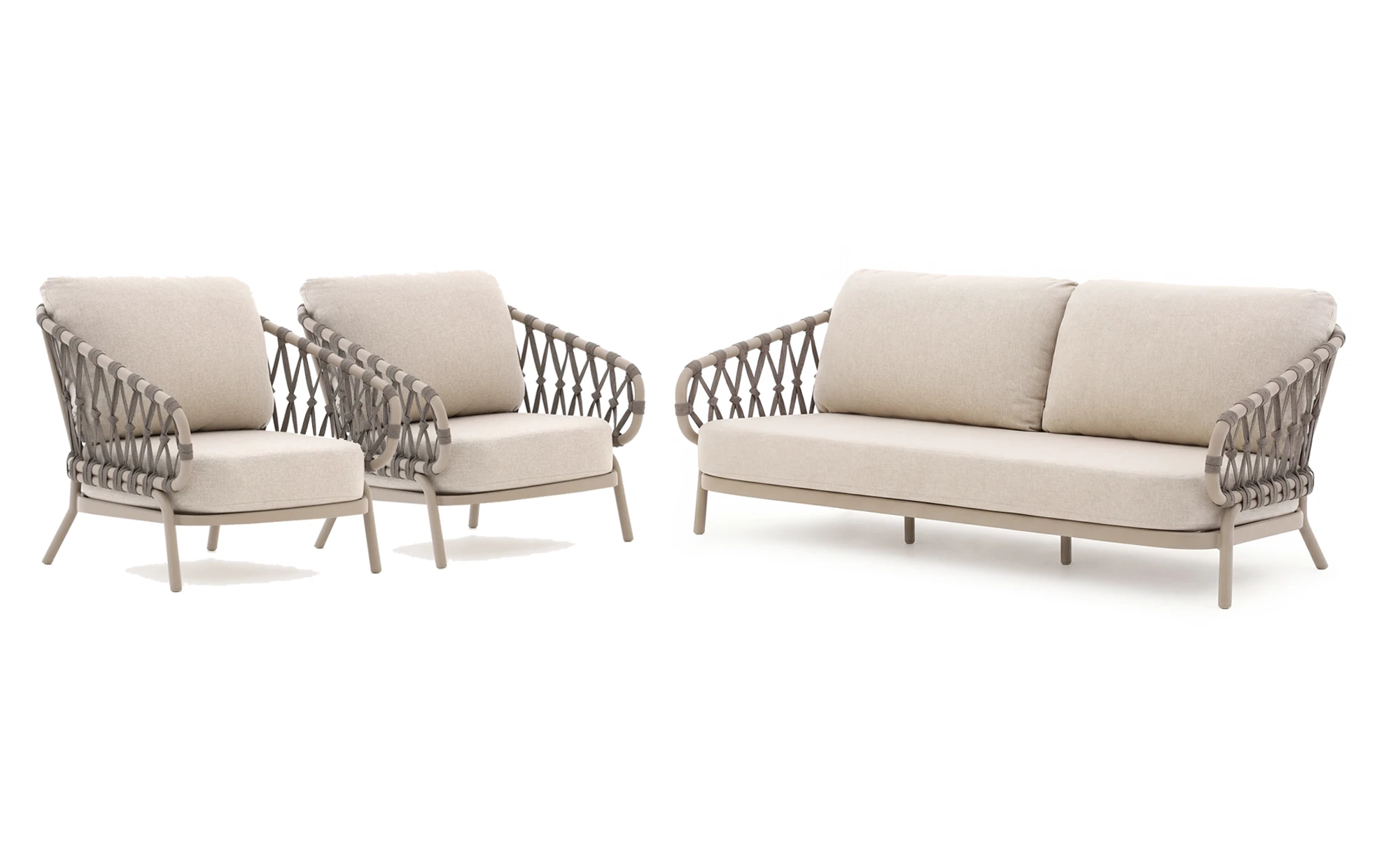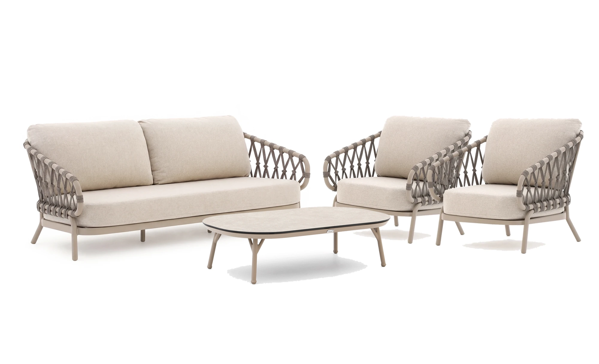 De Tierra Outdoor Natal loungeset is een elegante en comfortabele loungeset. De bank en loungestoelen hebben slanke aluminium frames met een champagne poedercoating. Verder zijn de loungers afgewerkt met prachtig rope vlechtwerk (touw van weerbestendig olefin). Dit geeft de set een luchtige en moderne uitstraling. De Natal loungeset wordt geleverd inclusief dikke zit- en rugkussens in een zachte zandkleur. Deze kussens zijn gemaakt van hoogwaardig Swiss Fabric olefin, wat zorgt voor aangenaam zitcomfort én uitstekende weerbestendigheid.